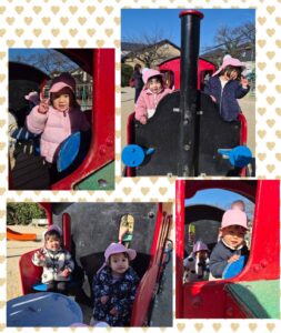 汽車の遊具であそびました!ハンドルを回し運転したり