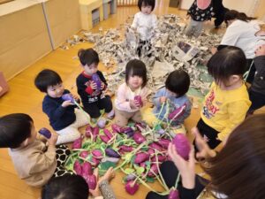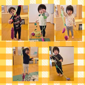おいもほり🍠 みんなでおいもほりごっこをしました!!🍠 ⭐️ぞうぐみ⭐️ 「うんとこしょどっこいしょ」とツルを引っ張り出てきたおいもに「おおきい〜!」「やったー!」と大喜びな子どもたちでしたよ😆🍠 🌟ぱんだ組🌟 ぱんだぐみさんは初めてのお芋掘り😊‼️ 少しドキドキしながらもツルを持つと自分からひっぱり、「ぽ〜んっ」と抜けたお芋にとっても嬉しそうでしたよ🍠😊✨ おいもがとれるとみんなで焼き芋ごっこをしていました😆 ← 🍂今週の様子🍂 年度別 2025 2024 2023 2022 2021 2020 2019 2018