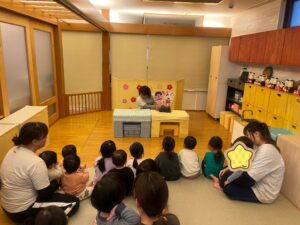 その後は、保育士出し物の『ぴょこたんのびっくりひなまつり』のペープサートを見ました✨